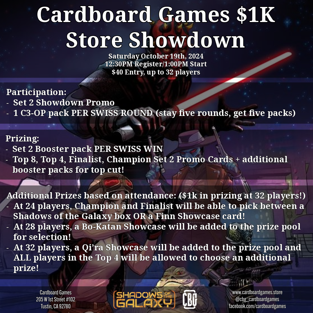 Back to All Events Star Wars: Unlimited - Store Showdown (October 19) Saturday, October 19, 2024 12:30 PM 9:00 PM Cardboard Games 205 West First Street Tustin, CA, 92780 United States (map) Google Calendar ICS Your #1 Orange County Star Wars shop! Cardboard Games is hosting our Shadows of the Galaxy season Store Showdown event on October 19! Be sure to check out the full list of Event postings and our News for updates.